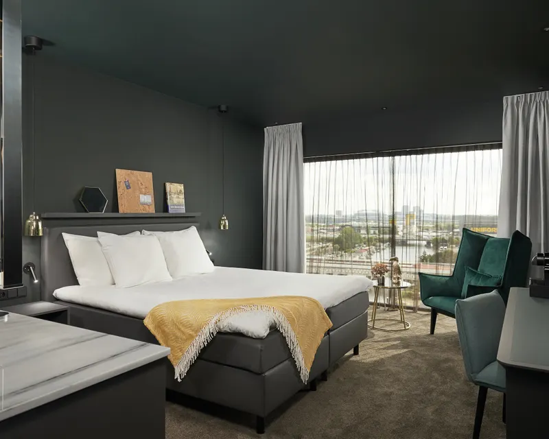 Entrez dans cette chaleureuse chambre verte de l'hôtel Van der Valk Amsterdam - Amstel et détendez-vous. Sur le lit double (180x210 cm), vous pouvez profiter pleinement de votre sommeil. Restez connecté grâce à la télévision à écran plat et au Wifi haut débit gratuit.